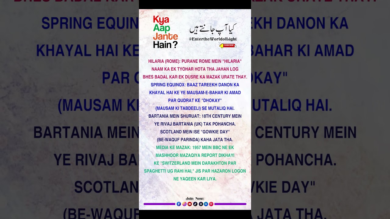 #islamic #trending #shorts #viralvideo #knowledge Welcome to π― EntertheWorldofLight π Did You Know? | duniya mein kitni amazing aur mind-blowing baatein chhupi hui hain? Is channel par aapko milenge interesting facts, unknown facts, aur daily knowledge** jo aapki soch badal denge! Yahan hum laate hain: ✔ Amazing Facts ✔ Mind-Blowing Information ✔ General Knowledge ✔ Viral & Trending Facts ✔ Educational Videos in Urdu/Hindi Agar aapko kya aap jaante hain, interesting facts , aur knowledge videos pasand hain, to yeh channel aapke liye perfect hai! π Subscribe karein EntertheWorldofLight ko** aur har roz naye facts aur knowledge videos dekhein. π Bell icon zaroor press karein taake aap koi bhi new video miss na karein! “ Like π Comment π¬ Subscribe π " ------ Join us : YouTube : π /@HolidaysShoppingDay Instagram : π /holidayshoppingday2024 π /entertheworldoflight Facebook : π /holidayshoppingday π /EntertheWorldofLight TikTok : π /@holidaysshoppingd π /@EntertheWorldofLight ---- Ignore It : kya aap jaante hain amazing facts interesting facts mind blowing facts unknown facts random facts daily facts knowledge for all general knowledge facts in urdu facts in hindi viral facts trending facts shocking facts educational video kya aap jaante hain amazing facts interesting facts in urdu hindi mind blowing facts you didn’t know daily amazing facts for knowledge general knowledge facts in urdu unknown facts about world viral facts 2026 viral facts 2025 2024 educational facts video in urdu top 10 amazing facts in hindi random interesting facts about life April Fool April Fool Islam April Fool in Islam Islam aur jhoot Jhoot ki saza Islam Mazak mein jhoot Islamic reminder April Fool history April Fool reality Kya April Fool jaiz hai